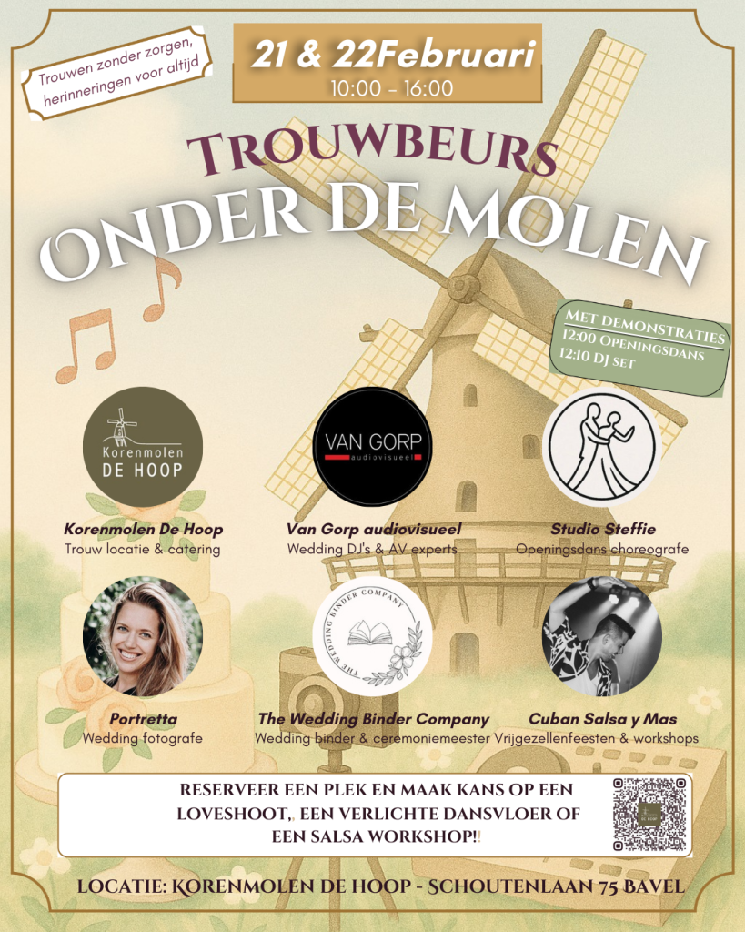Op 21 & 22 februari 2026 staan we op de trouwbeurs in Korenmolen De Hoop in Bavel Zien we jullie daar?